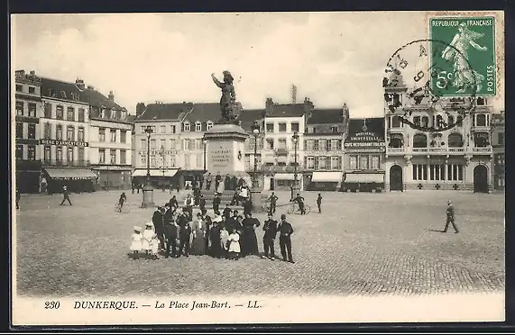 AK Dunkerque, La Place Jean-Bart avec statue et groupes de passants