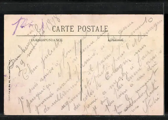 Personenbezogene Daten auf der Rückseite der Karte wurden durch blauen Textmarker unkenntlich gemacht. Die blauen Stellen sind auf die Vorderseite durchgeweicht und wirken sich negativ auf das Postkartenfoto aus