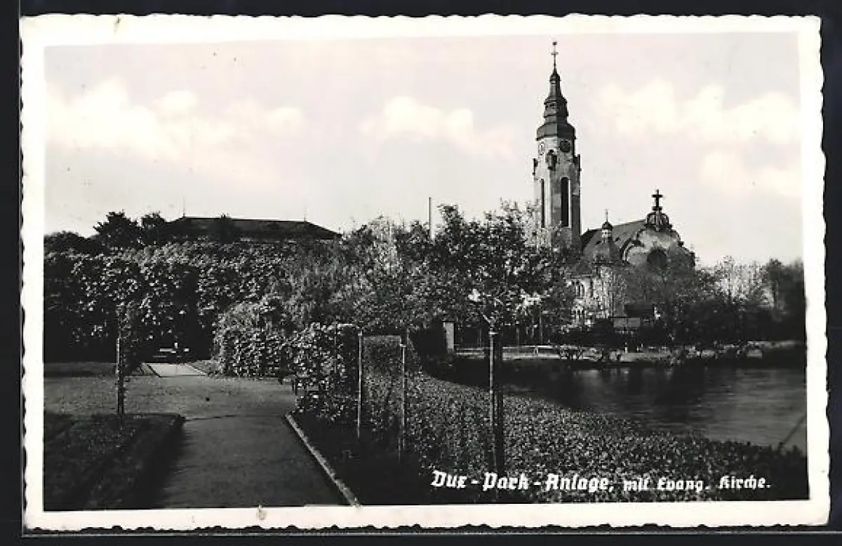 AK Dux, Park-Anlage mit Evang. Kirche