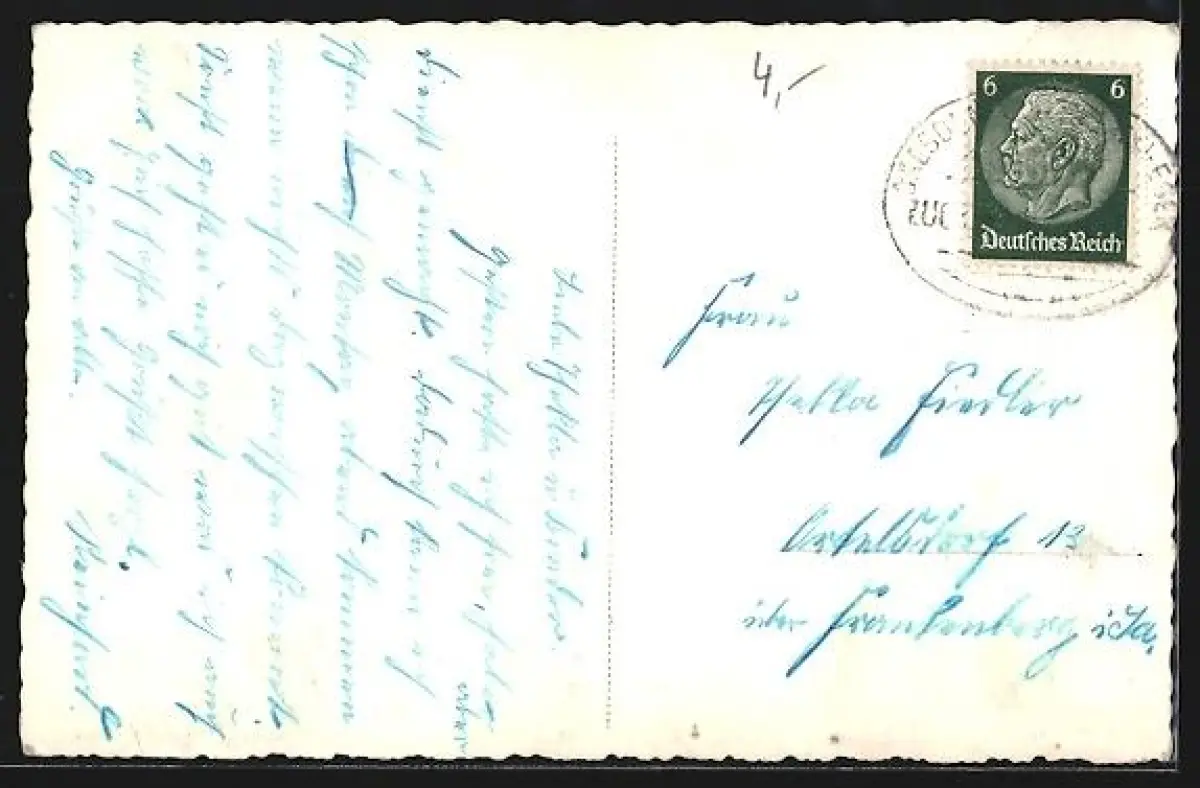 Personenbezogene Daten auf der Rückseite der Karte wurden durch blauen Textmarker unkenntlich gemacht. Die blauen Stellen sind auf die Vorderseite durchgeweicht und wirken sich negativ auf das Postkartenfoto aus