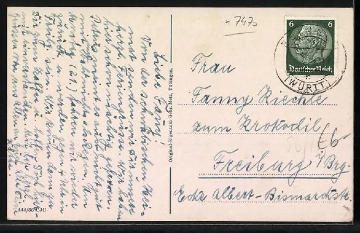 Personenbezogene Daten auf der Rückseite der Karte wurden durch blauen Textmarker unkenntlich gemacht. Die blauen Stellen sind auf die Vorderseite durchgeweicht und wirken sich negativ auf das Postkartenfoto aus