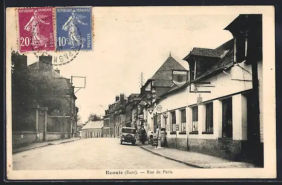 AK Écouis, Rue de Paris avec voitures anciennes et bâtiments historiques