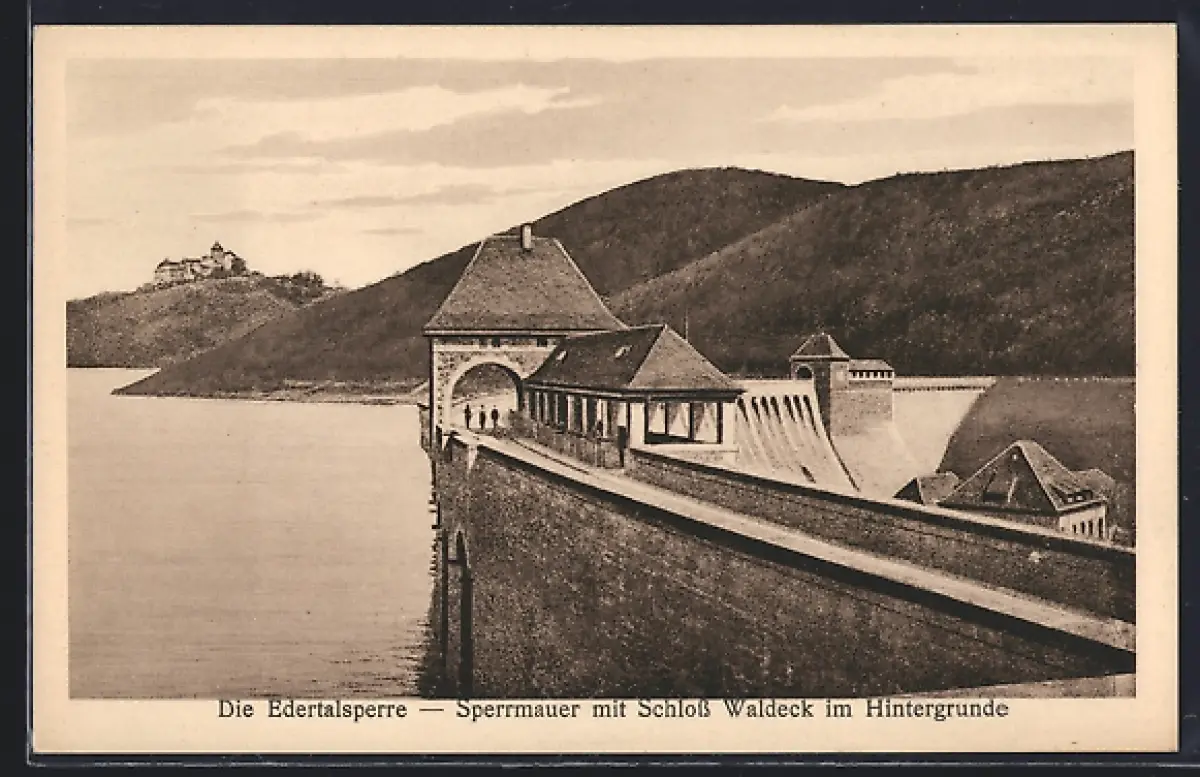 AK Edertalsperre, Sperrmauer mit Schloss Waldeck im Hintergrund