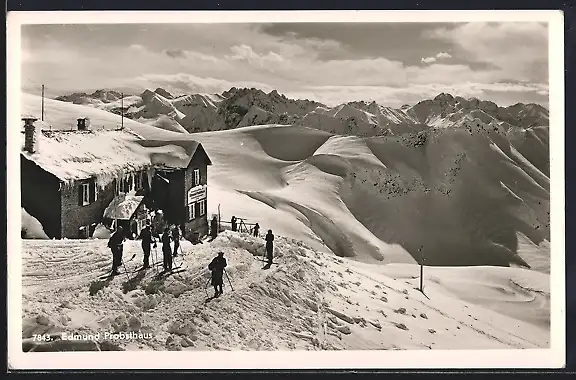 AK Edmund Probsthaus, eingeschneite Berghütte mit Blick zum Höfats & Mädelgabel