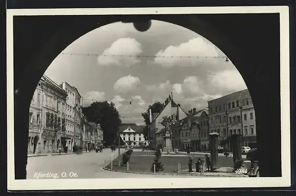 AK Eferding /O.-Oe, Strassenpartie mit Denkmal durch Tor