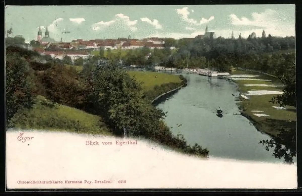 AK Eger, Ortspanorama vom Egerthal aus, Flusspartie