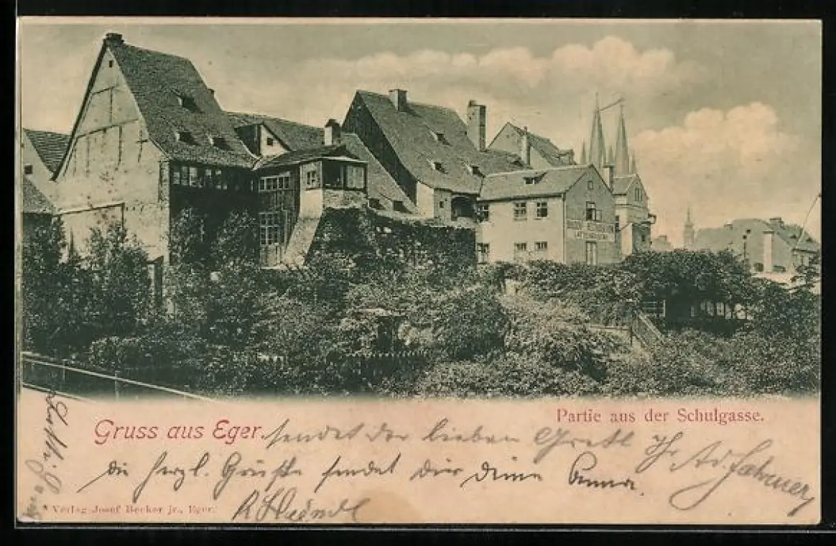 AK Eger, Partie aus der Schulgasse, Brusch`s Restaurant