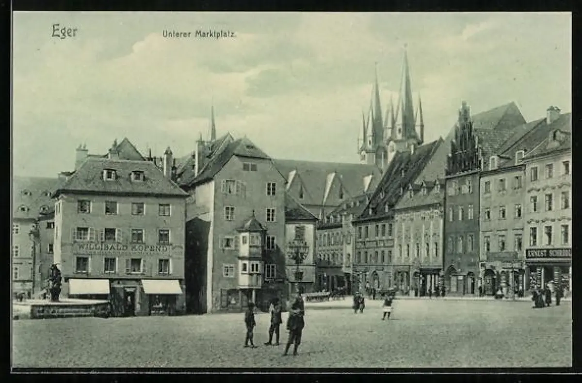 AK Eger, Unterer Marktplatz mit Zentral-Drogerie und Geschäften