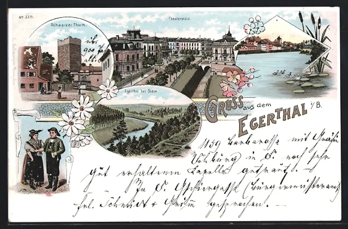 AK Egerthal i. B., Schwarzer Turm, Theaterplatz, Egertal bei Stein, Paar in Tracht