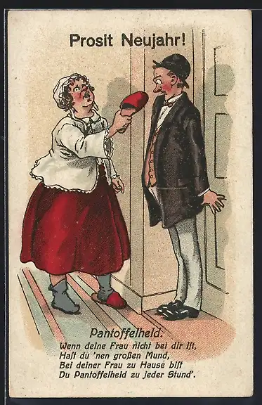 AK Ehefrau bedroht Pantoffelhelden mit ihrer Galosche