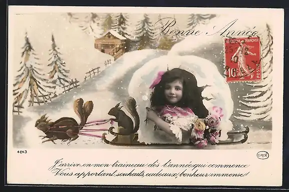AK Eichhörnchen fährt im von Eichhörnchen gezogenem Schlitten, Mädchen mit Rosen, Neujahrsgruss
