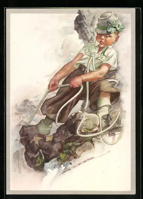 AK Ein Junge beim Bergsteigen mit einem Seil an einem Felsen