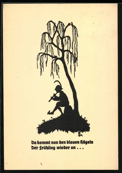 AK Ein Junge mit Federhut spielt unter einer kahlen Weide Flöte, Schattenbild