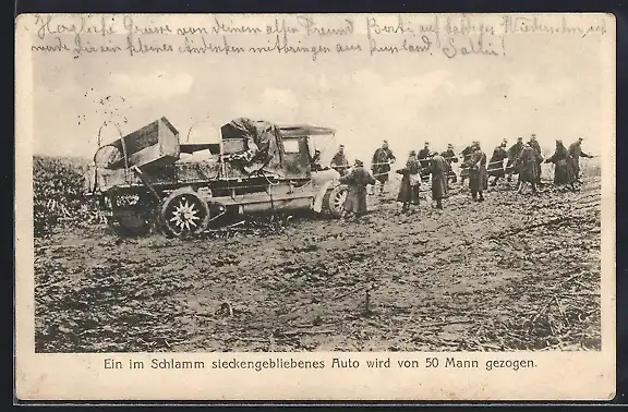 AK Ein im Schlamm steckengebliebener Lastkraftwagen wird von 50 Männern gezogen