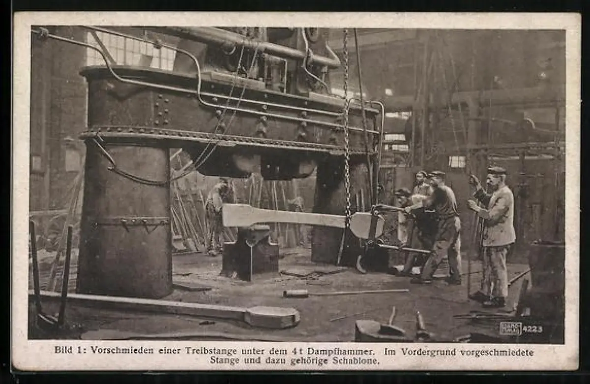 AK Eisenbahn-Fabrikarbeiter, Vorschmieden einer Treibstange unter dem 4t Dampfhammer