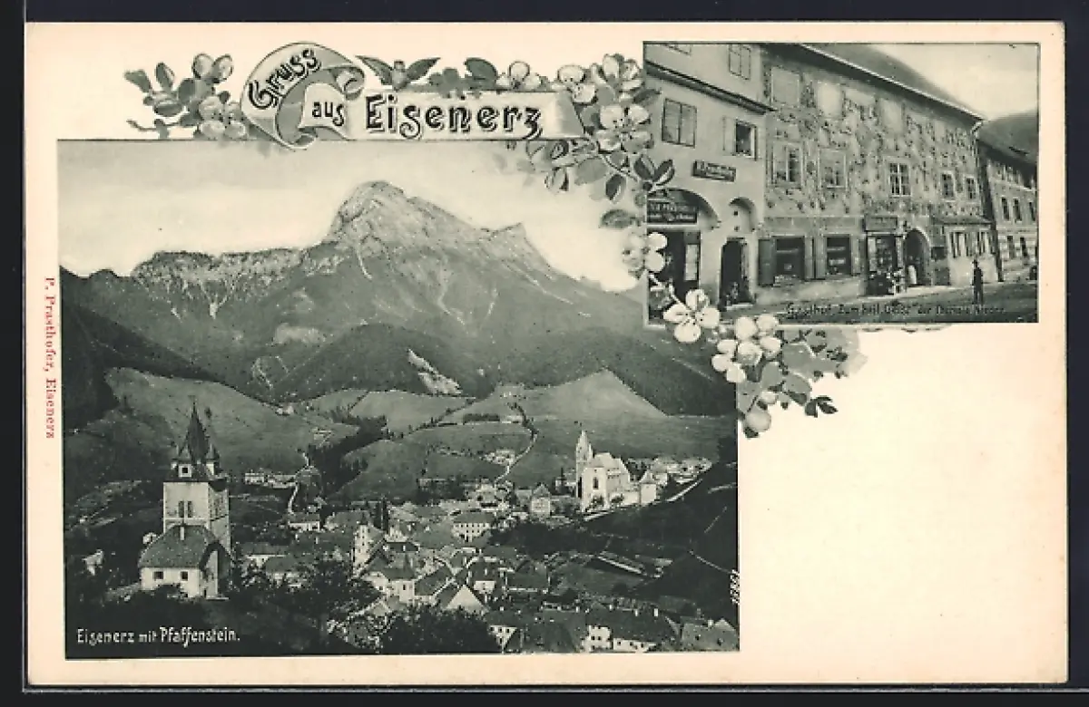 AK Eisenerz, Gasthof Zum heiligen Geist, Teilansicht mit Pfaffenstein