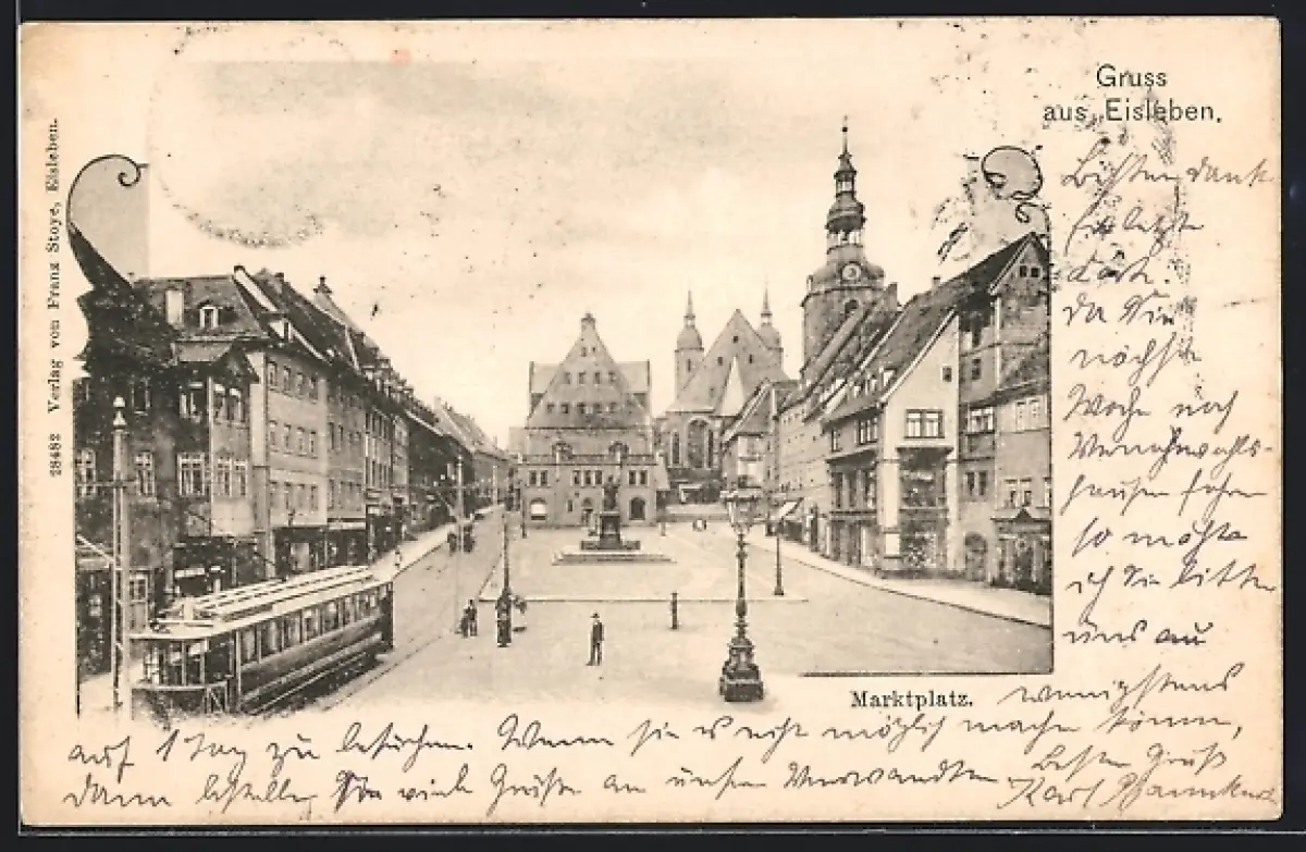 AK Eisleben, Marktplatz mit Strassenbahn und Denkmal