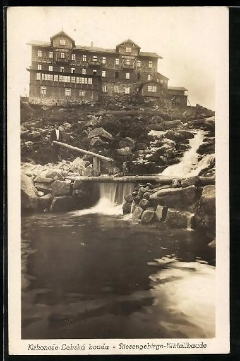AK Elbfallbaude /Riesengebirge, Berghütte mit Elbfall