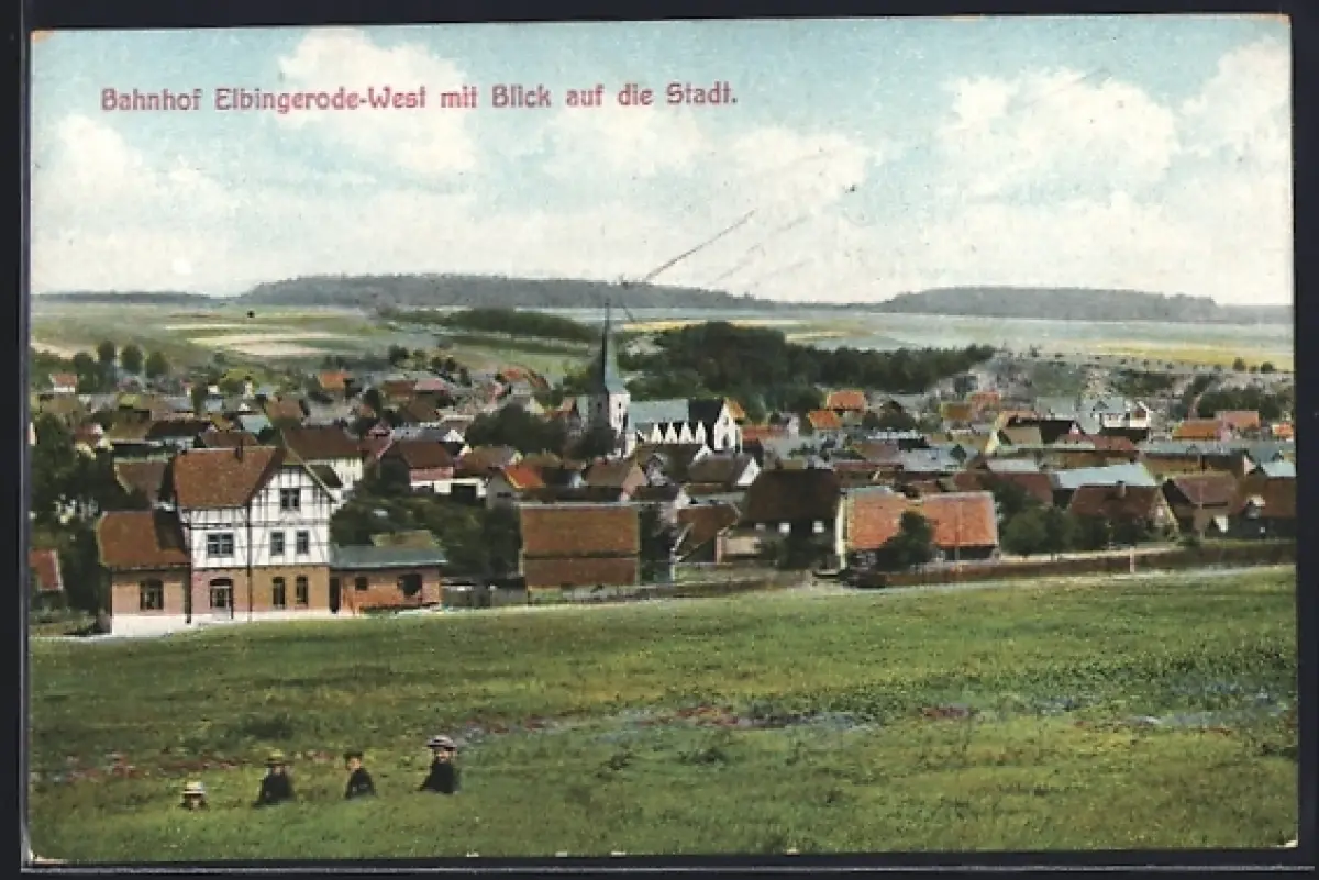 AK Elbingerode, Blick auf die Stadt, Kinder auf der Wiese