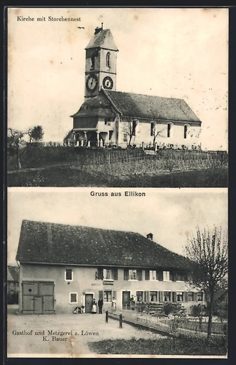 AK Ellikon, Gasthof und Metzgerei zum Löwen, Inh. K. Bauer, Kirche mit Storchennest