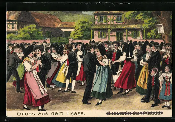 AK Elsäsische Paar tanzen in Trachtenkleidung auf dem Marktplatz