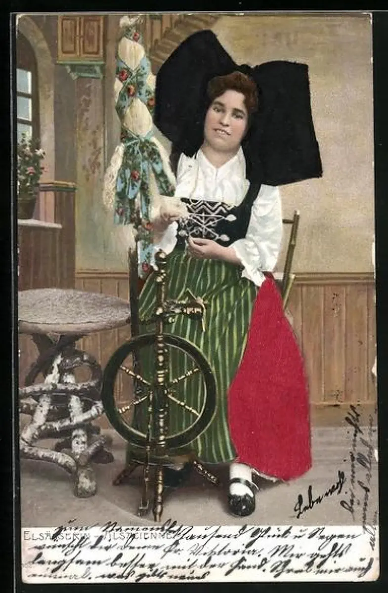 AK Elsässerin in elsass-lothringischer Tracht am Spinnrad