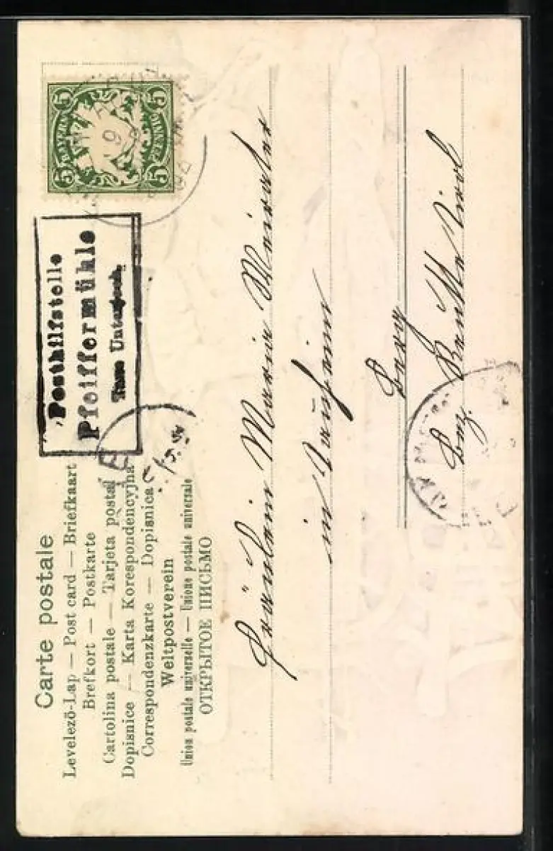 Personenbezogene Daten auf der Rückseite der Karte wurden durch blauen Textmarker unkenntlich gemacht. Die blauen Stellen sind auf die Vorderseite durchgeweicht und wirken sich negativ auf das Postkartenfoto aus