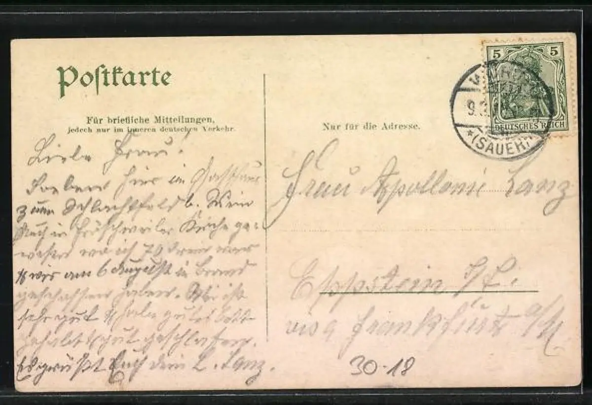 Personenbezogene Daten auf der Rückseite der Karte wurden durch blauen Textmarker unkenntlich gemacht. Die blauen Stellen sind auf die Vorderseite durchgeweicht und wirken sich negativ auf das Postkartenfoto aus