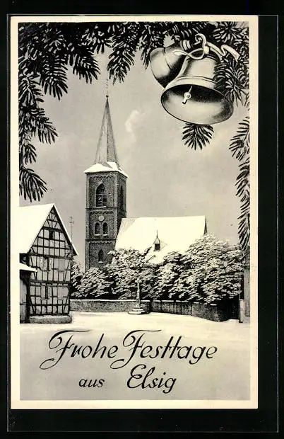 AK Elsig, Kirche im Winter, Frohe Festtage