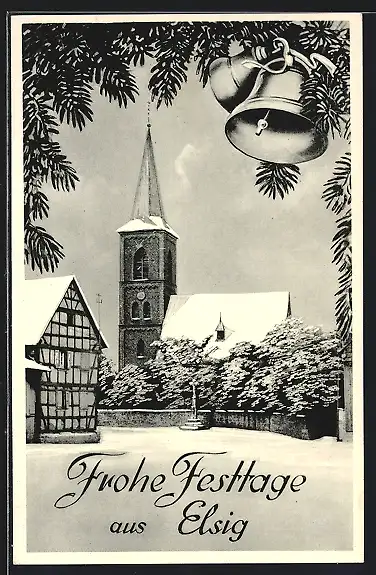 AK Elsig, Kirche im Winter, Frohe Festtage