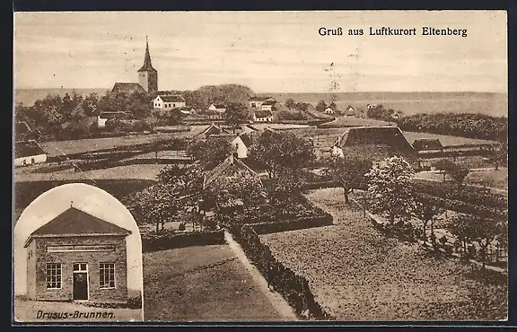 AK Eltenberg, Gesamtansicht mit Kirchturm und Drusus-Brunnen