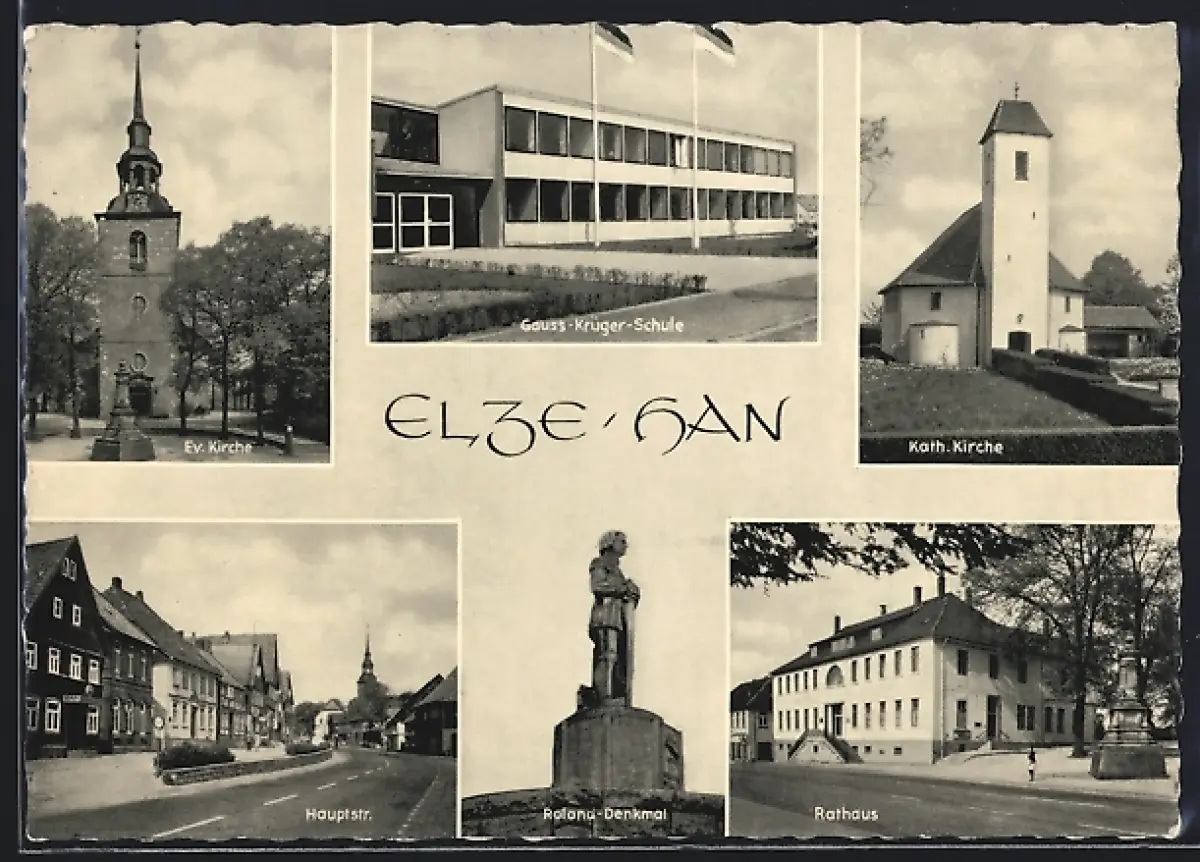 AK Elze /Han., Gauss-Krüger-Schule, Rathaus, Roland-Denkmal