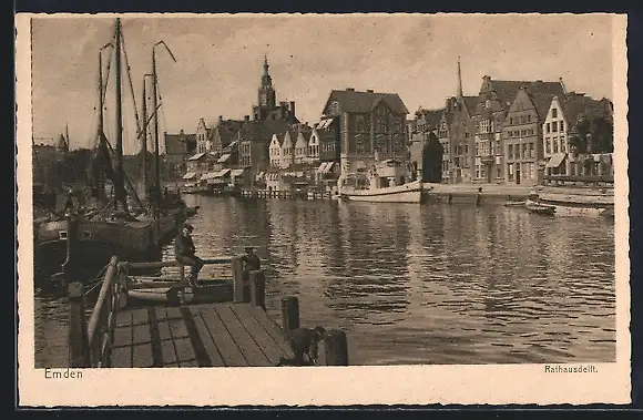 AK Emden, Partie am Hafen mit Segelbooten und kleinem Dampfschiff