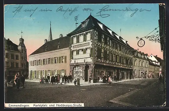 AK Emmendingen, Marktplatz u. Hochburger Strasse, mit kleiner Versammlung, Kirchturm