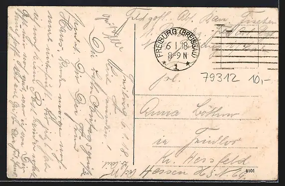 gelaufen 1918, Eckknicke oben u. re., guter Zustand