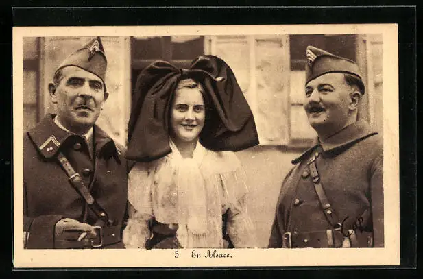 AK En Alsace, Elsässerin in Tracht mit franz. Soldaten