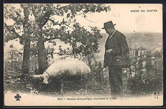 AK En Périgord, Groupe sympathique cherchant la truffe, Mann mit Trüffelschwein