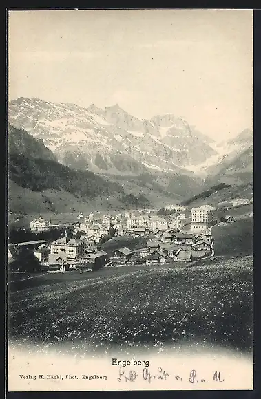 AK Engelberg, Ortsansicht mit Bergpanorama