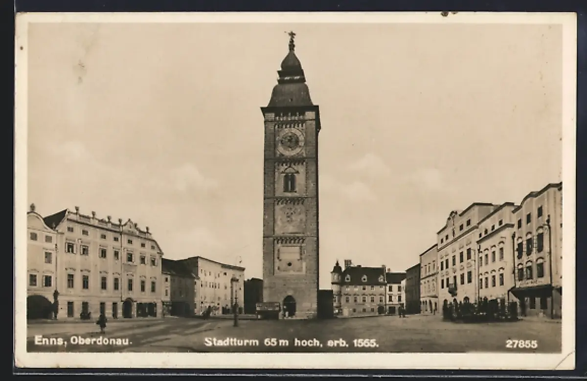 AK Enns /Oberdonau, Stadtturm und Häuser-Panorama