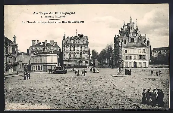 AK Epernay, La Place de la République et la Rue du Commerce, Pferdebahn