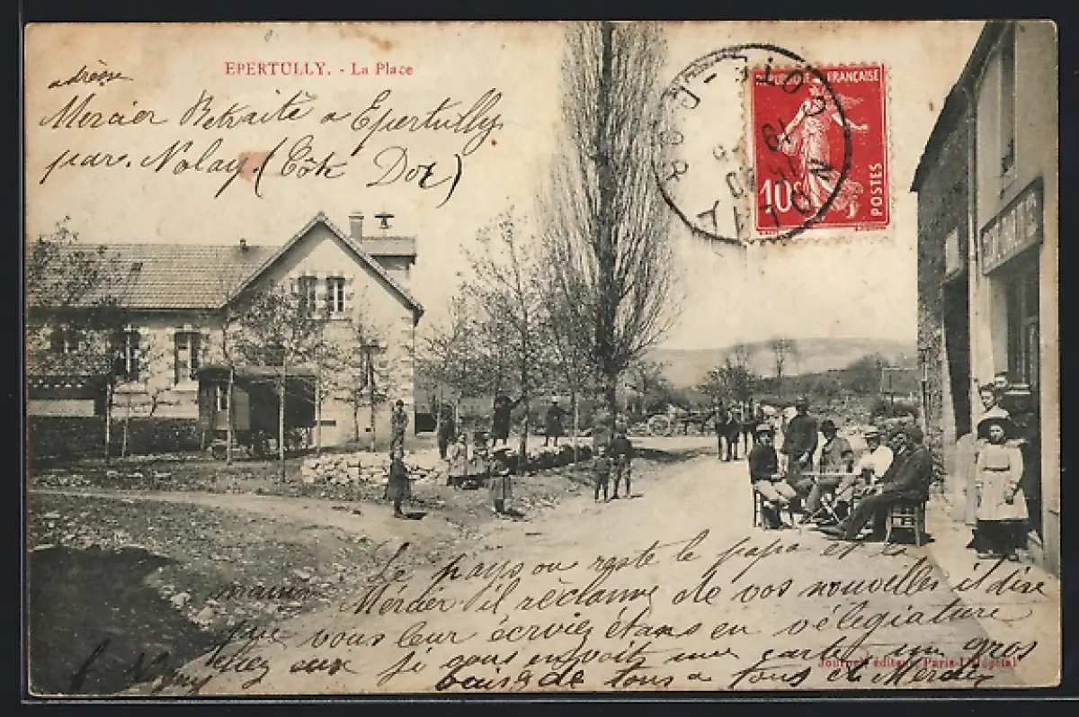 AK Epertully, La Place, Einwohner sitzen vorm Cafe