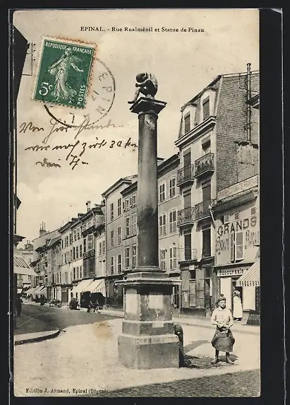 AK Epinal, Rue Rualménil et Statue de Pinau
