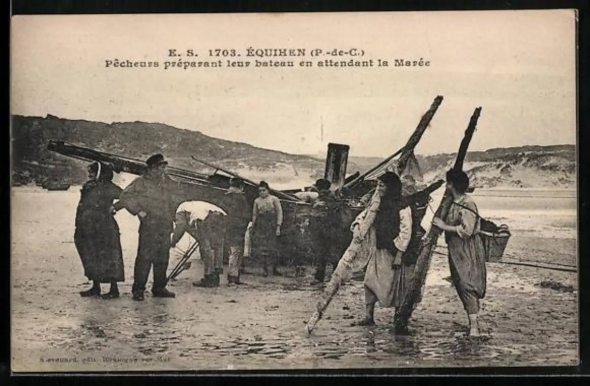 AK Équihen /P.-de-C., Fischer mit ihren Boot am Strand