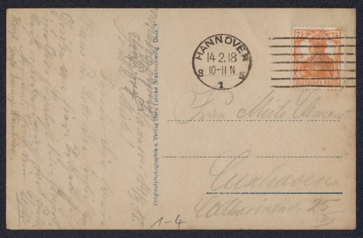 Personenbezogene Daten auf der Rückseite der Karte wurden durch blauen Textmarker unkenntlich gemacht. Die blauen Stellen sind auf die Vorderseite durchgeweicht und wirken sich negativ auf das Postkartenfoto aus