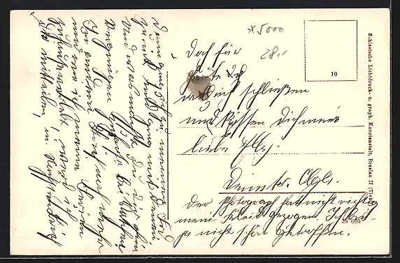 Personenbezogene Daten auf der Rückseite der Karte wurden durch blauen Textmarker unkenntlich gemacht. Die blauen Stellen sind auf die Vorderseite durchgeweicht und wirken sich negativ auf das Postkartenfoto aus