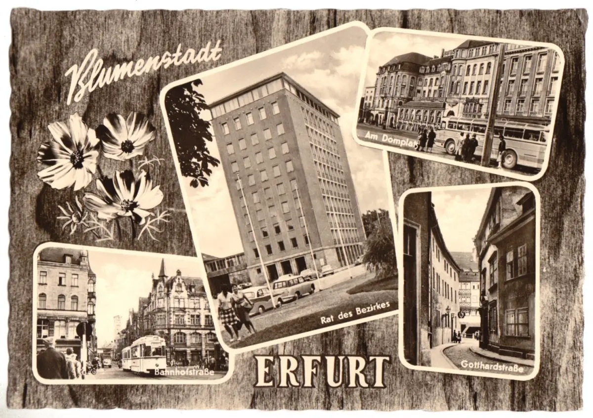 Ansichtskarte Erfurt vier Abb., gestaltet Bahnhofstr., Rat des Bezirkes, Am Domplatz, Gotthardstr. Erhaltung I-II postalisch gelaufen, gestempelt: Erfurt, unleserlich Druckvermerk: 1961 Herstellungsland: DDR Verlag: KONSUM Foku Magdeburg