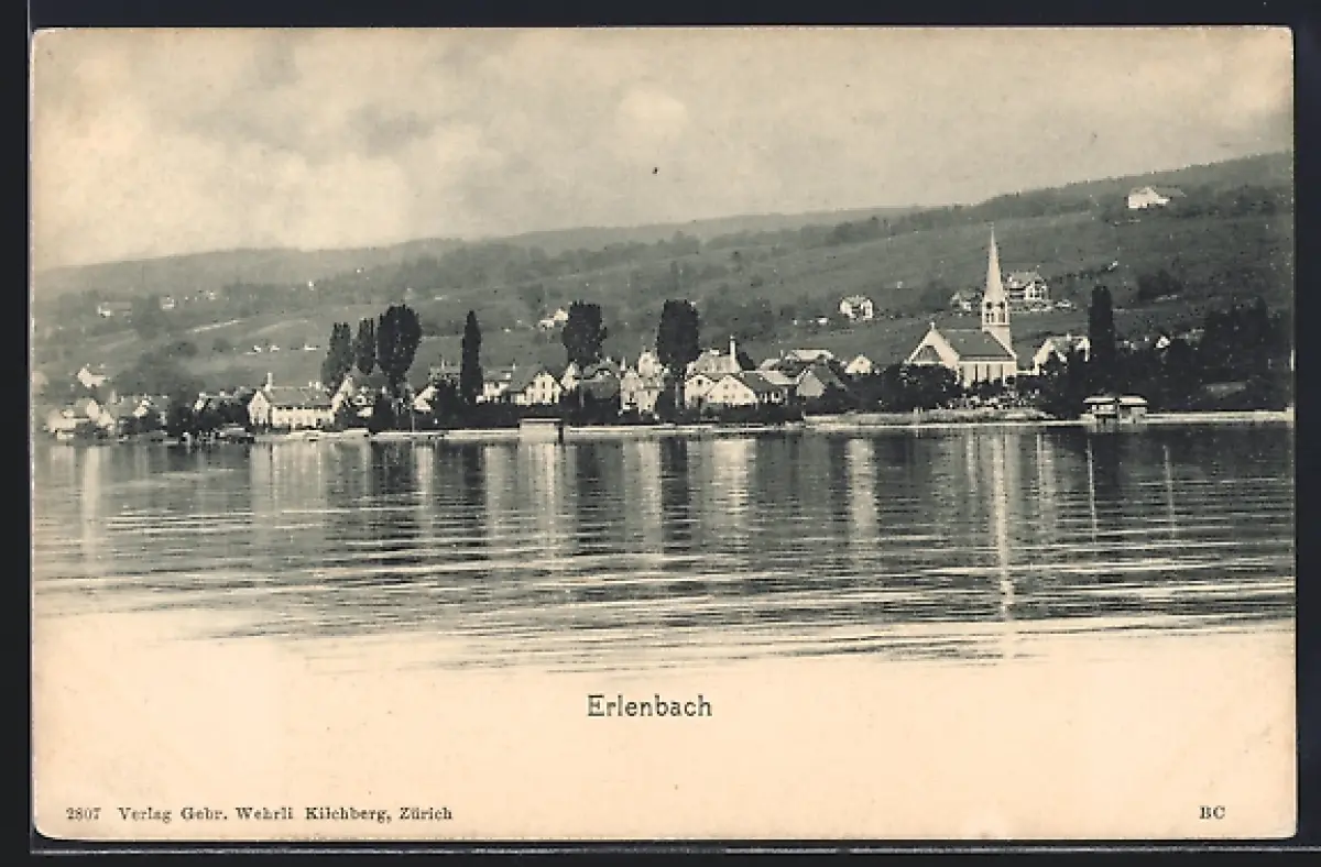 AK Erlenbach /ZH, Panorama mit Zürichsee und Kirche