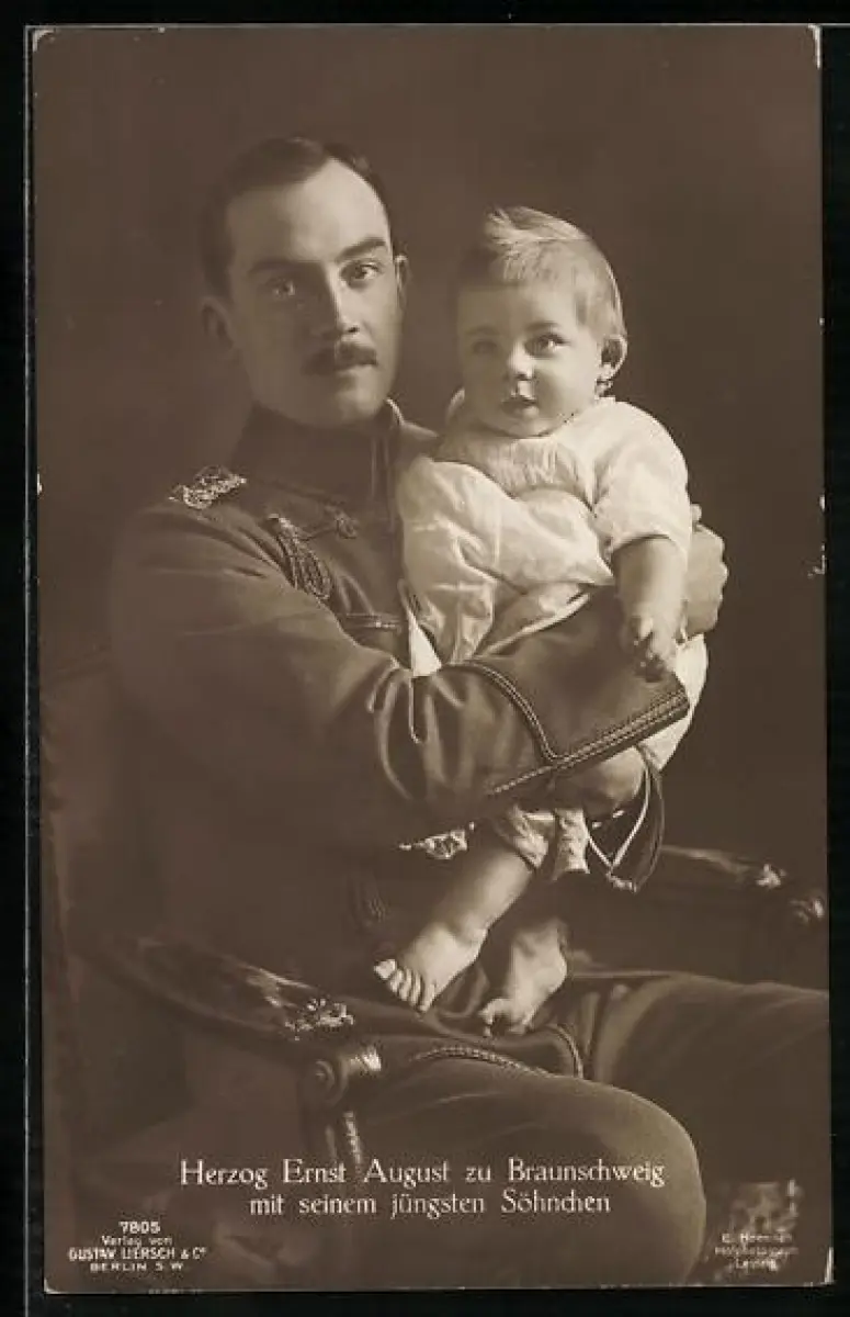 AK Ernst August Herzog von Braunschweig in Uniform mit seinem jüngsten Söhnchen auf Stuhl sitzend