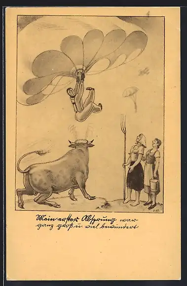 AK Erster Absprung eines Fallschirmjägers endet auf dem Gehörn eines Stiers
