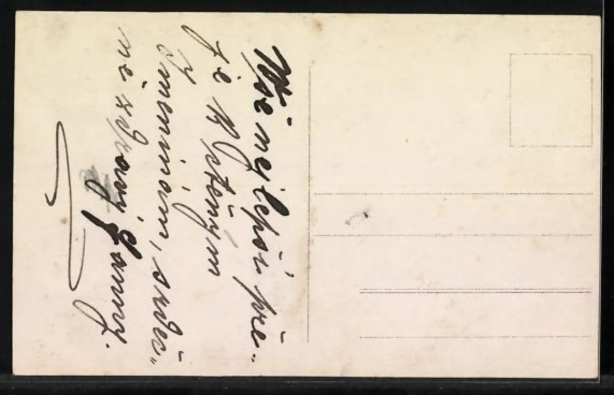 Personenbezogene Daten auf der Rückseite der Karte wurden durch blauen Textmarker unkenntlich gemacht. Die blauen Stellen sind auf die Vorderseite durchgeweicht und wirken sich negativ auf das Postkartenfoto aus